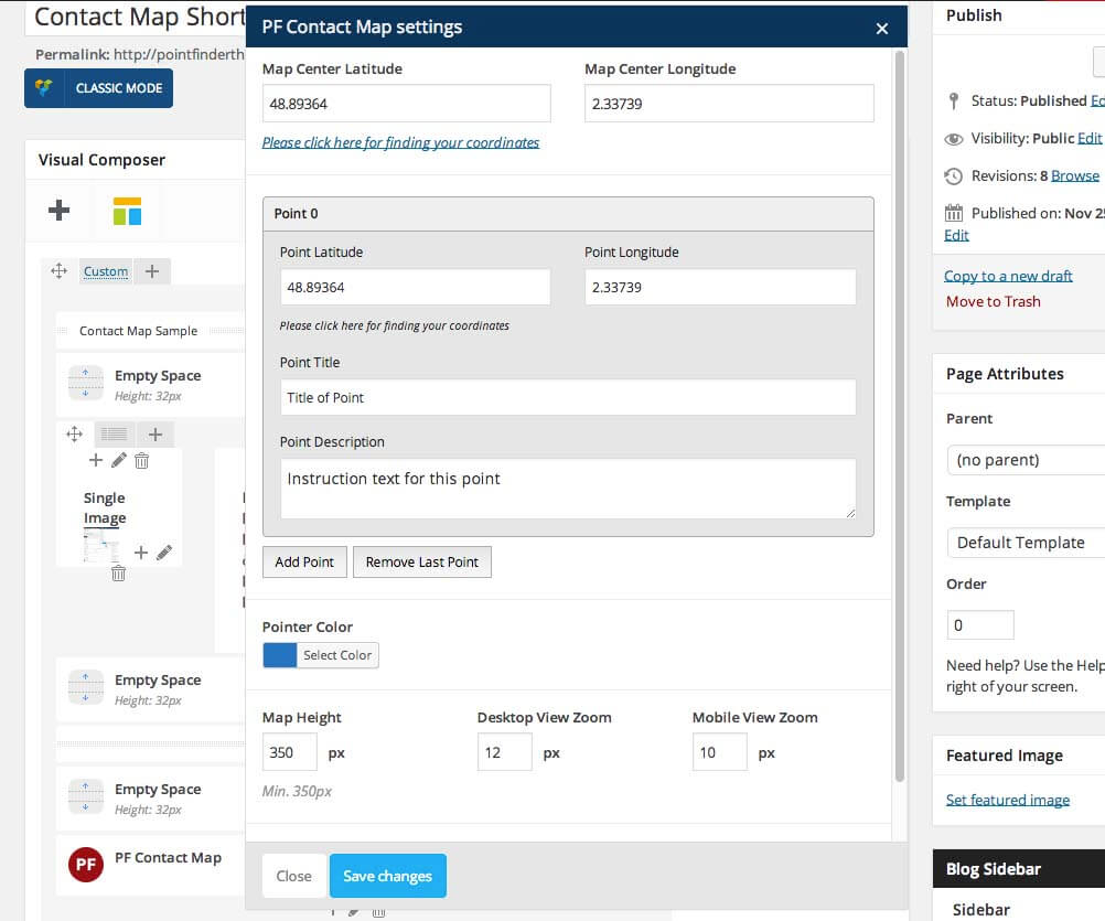 You can easily add your contact map to PointFinder through Visual Composer. You can create as much as points you want and change their contents. You can also change various controls such as map type.